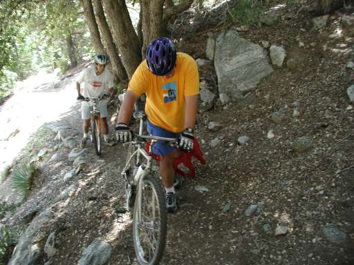 Hi res | Lo res | Byondo To-D rides dangerously close to the Do-D (Drop of Death). One false move would spell doom on this section, which is nearly impassable to human bikers. Byondo rides it with ease as Zippy leads the way. |