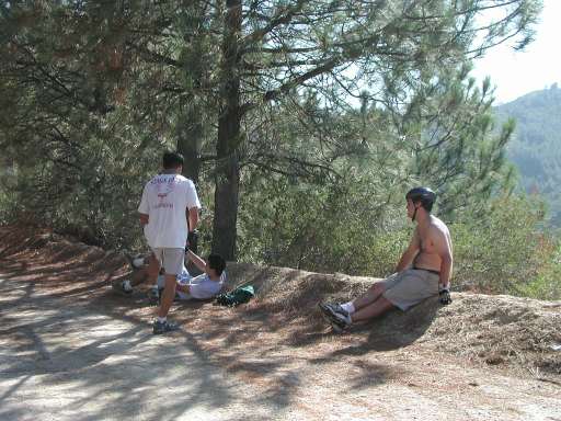 Hi res | Lo res | The BIKE GODS stop to discuss their plan for getting to the top of the trail. After much consideration, the consensus is that they should keep going up. |